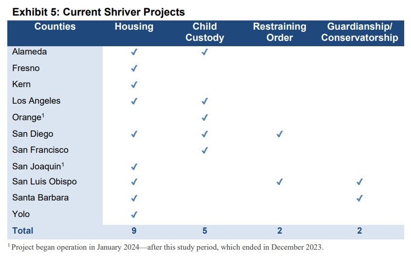 - Shriver program currently operates 14 projects in 11 counties, which help litigants with legal issues such as housing, child custody, guardianship/conservatorship, and restraining orders
